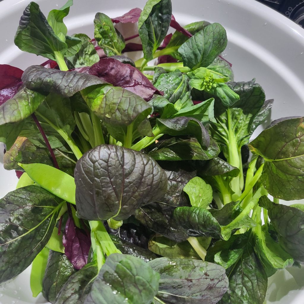 This is the purple bok choy, beet leaves, and peas that I harvested this morning for an Asian salad later today.