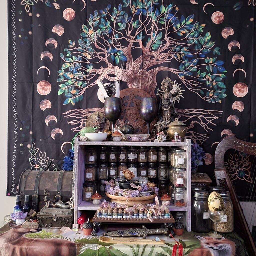Then I changed my altar up a bit. Put a new background tapestry behind it and rearranged some of the things. It makes for a nice focus of my intentions as I do my work. It’s a bit darker than I usually go for, but it is still quite lovely to look at. It makes that area feel more unified.