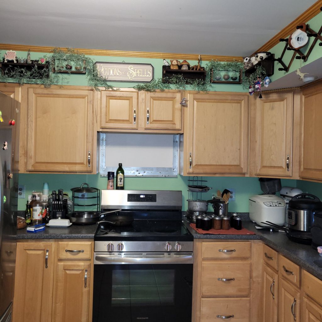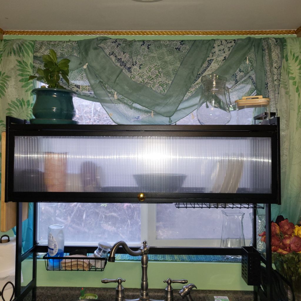 Then I went into the kitchen. This has been my main focus recently. I have had an idea for the kitchen for a while now, putting a long shelf along the top of the wall and having dried herbs and flowers hanging from it. I decided a bunch of smaller shelves and propagator vases filled with herbs and crystals. I added to it two expanding diamond coffee racks to hang mugs, dried herbs and flowers, and any other item that can be hung. They are now waiting for next year to be filled with those dried elements. My shelf decorations are themed. The first one is my “Me Shelf”. It represents me. The next shelf is my “Nature” shelf. It reminds me of the critters that live on the property that I share with them. The next shelf is my “Anime/Gaming” shelf, and all the objects represent anime and games my kids and I have fond memories of. (Animal Crossing, Studio Ghibli, Legend of Zelda, Yu-Ghi-Oh) The last shelf is fun creatures turned into objects that I have found through the years. I got some garland and strung it through the shelves, which I love. I painted the walls a color called “Relish”. At first, I thought it might be too vibrant, but when it dried, it actually made the kitchen seem brighter and more welcoming. I got some great decorative outlet and light switch plates that remind me of “Grandma’s Bathroom Wallpaper”, but they fit in so incredibly well. (Shout out to Wallplates.com!) I got a couple scarves and an over the sink organizer and decorated the window with the scarves. It’s very boho chic. The only things left to do in the kitchen are the countertop and getting slow close fittings for the cabinets and drawers! It has really become one of my favorite rooms now!
