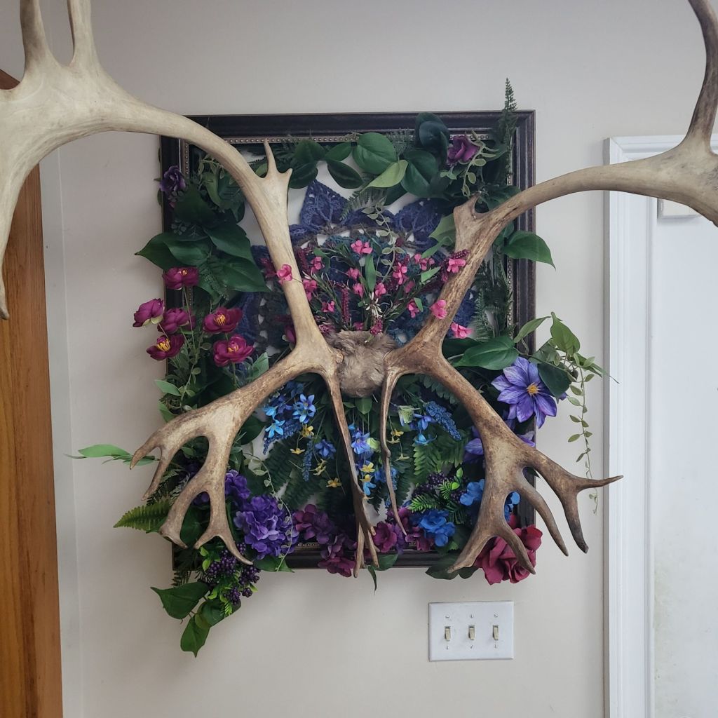 Once I had the brooms up, I had a large frame that was not being used and a set of elk antlers from my father’s hunting as a youth. I had no idea what to do with either, till I decided to put them together! Elmer sits across from the brooms in the entryway. I took a mandala I had crocheted and put it as the base, then put floral parts along the frame and into the mandala. I LOVE it! He’s a bit askew at the moment from too many tall people experiencing Elmer up close, but he will have a new home when I get to work on the next project I want to undertake.